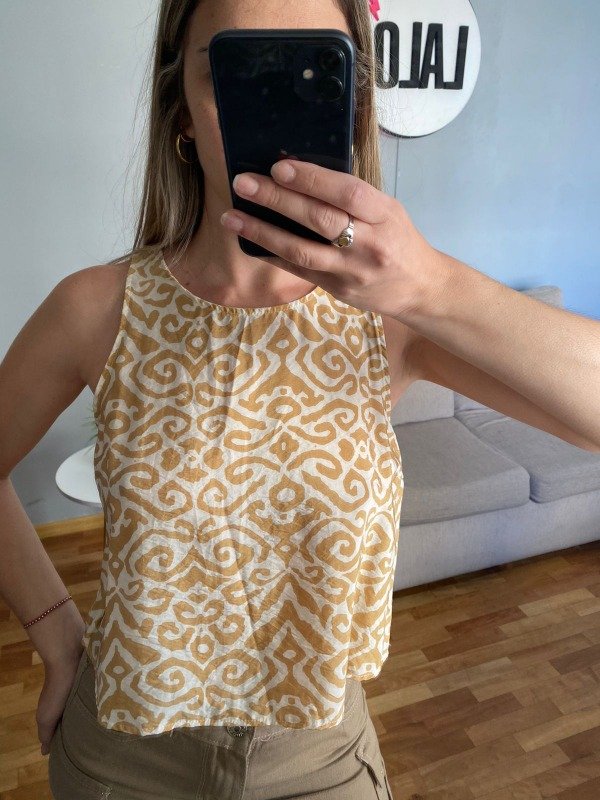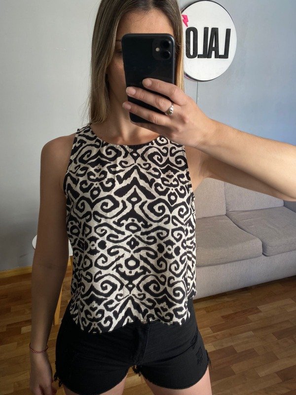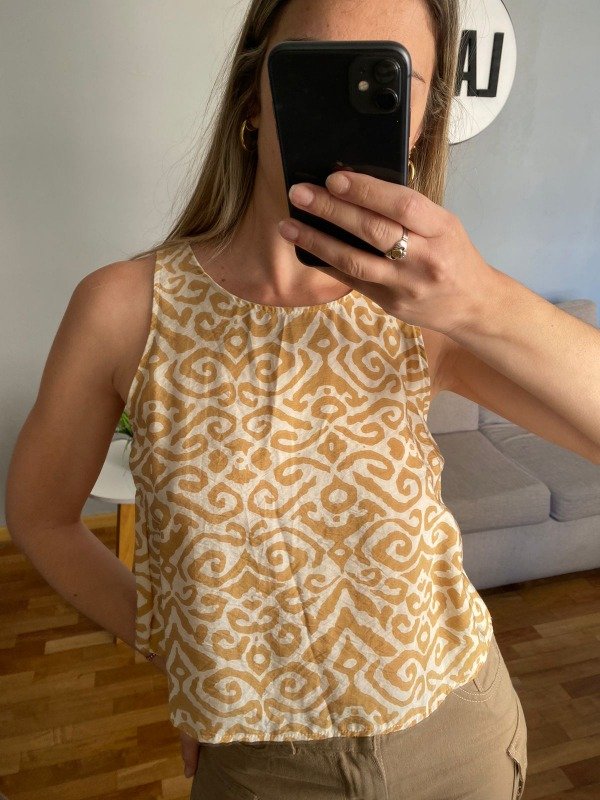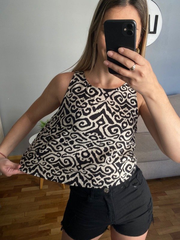 Musculosa de seda estampada, con detalle de boton en la espalda.